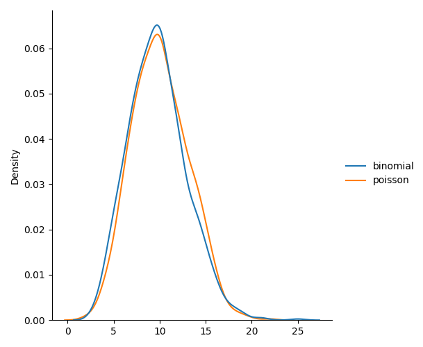 但对于非常大的 n 和接近于零的 p,二项式分布几乎与泊松分布相同,因此 n * p 几乎等于 lam。