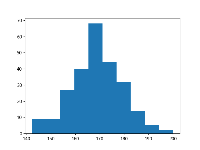 # 以下三行代码使编译器支持绘图功能: import sys import matplotlib matplotlib.use('Agg') import matplotlib.pyplot as plt import numpy as np # 生成正态分布数据: x = np.random.normal(170, 10, 250) # 均值 170,标准差 10,250 个数据点 # 绘制直方图: plt.hist(x) # 创建直方图 plt.show() # 显示图表 # 以下两行代码使编译器能够输出图形: plt.savefig(sys.stdout.buffer) sys.stdout.flush()