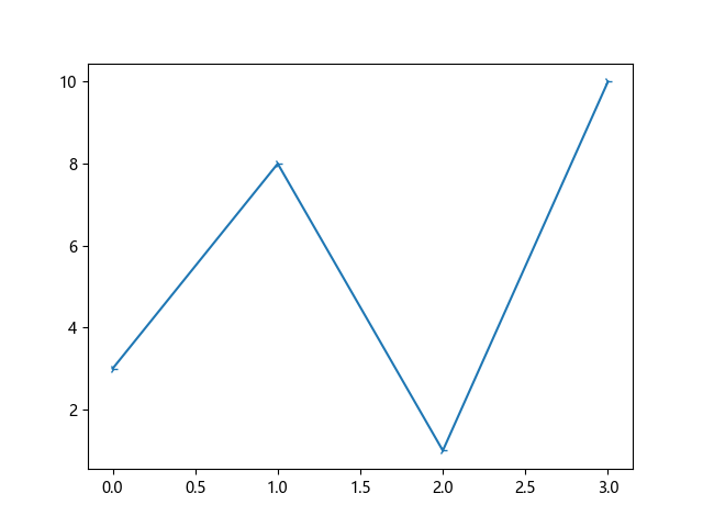 # 这三行代码使编译器能够绘图: import sys import matplotlib matplotlib.use('Agg') import matplotlib.pyplot as plt import numpy as np ypoints = np.array([3, 8, 1, 10]) # 使用朝右的三线标记绘制 plt.plot(ypoints, marker = '4') plt.show() # 这两行代码使编译器能够输出图形: plt.savefig(sys.stdout.buffer) sys.stdout.flush()
