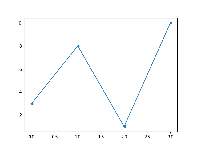 # 这三行代码使编译器能够绘图: import sys import matplotlib matplotlib.use('Agg') import matplotlib.pyplot as plt import numpy as np ypoints = np.array([3, 8, 1, 10]) # 使用左三角标记绘制 plt.plot(ypoints, marker = '<') plt.show() # 这两行代码使编译器能够输出图形: plt.savefig(sys.stdout.buffer) sys.stdout.flush()