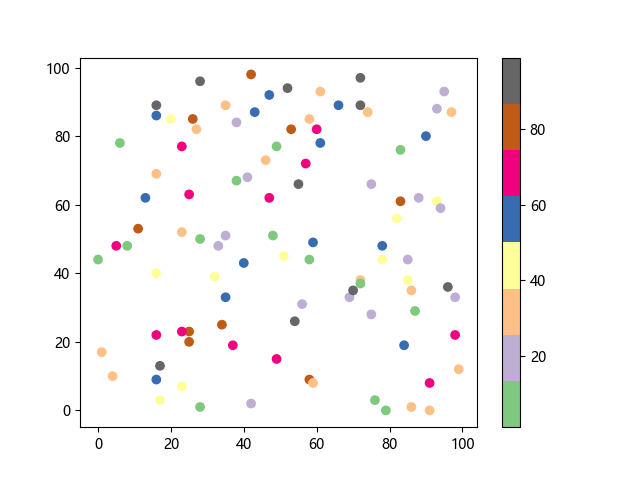 # 这三行代码使编译器能够绘图: import sys import matplotlib matplotlib.use('Agg') import matplotlib.pyplot as plt import numpy as np x = np.random.randint(100, size=(100)) y = np.random.randint(100, size=(100)) colors = np.random.randint(100, size=(100)) # 使用强调色系绘制散点图: plt.scatter(x, y, c=colors, cmap='Accent') plt.colorbar() plt.show() # 这两行代码使编译器能够输出图形: plt.savefig(sys.stdout.buffer) sys.stdout.flush()