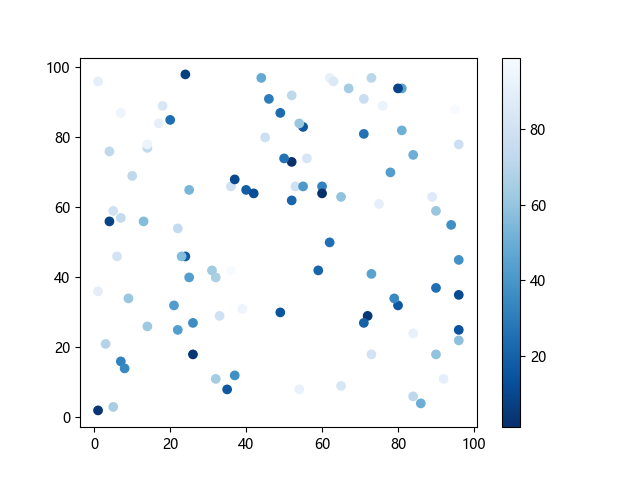 # 这三行代码使编译器能够绘图: import sys import matplotlib matplotlib.use('Agg') import matplotlib.pyplot as plt import numpy as np x = np.random.randint(100, size=(100)) y = np.random.randint(100, size=(100)) colors = np.random.randint(100, size=(100)) # 使用反向蓝色渐变绘制散点图: plt.scatter(x, y, c=colors, cmap='Blues_r') plt.colorbar() # 显示颜色条 plt.show() # 显示图形 # 这两行代码使编译器能够输出图形: plt.savefig(sys.stdout.buffer) sys.stdout.flush()
