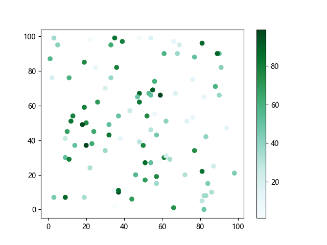 # 这三行代码使编译器能够绘图: import sys import matplotlib matplotlib.use('Agg') import matplotlib.pyplot as plt import numpy as np x = np.random.randint(100, size=(100)) y = np.random.randint(100, size=(100)) colors = np.random.randint(100, size=(100)) # 使用蓝绿色渐变绘制散点图: plt.scatter(x, y, c=colors, cmap='BuGn') plt.colorbar() # 显示颜色条 plt.show() # 显示图形 # 这两行代码使编译器能够输出图形: plt.savefig(sys.stdout.buffer) sys.stdout.flush()