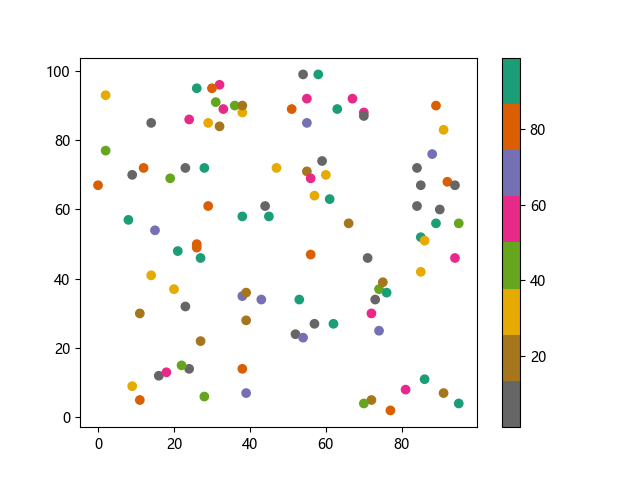 # 这三行代码使编译器能够绘图: import sys import matplotlib matplotlib.use('Agg') import matplotlib.pyplot as plt import numpy as np x = np.random.randint(100, size=(100)) y = np.random.randint(100, size=(100)) colors = np.random.randint(100, size=(100)) # 使用反向 Dark2 配色方案绘制散点图: plt.scatter(x, y, c=colors, cmap='Dark2_r') plt.colorbar() plt.show() # 这两行代码使编译器能够输出图形: plt.savefig(sys.stdout.buffer) sys.stdout.flush()