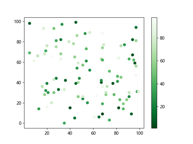 # 这三行代码使编译器能够绘图: import sys import matplotlib matplotlib.use('Agg') import matplotlib.pyplot as plt import numpy as np x = np.random.randint(100, size=(100)) y = np.random.randint(100, size=(100)) colors = np.random.randint(100, size=(100)) # 使用反向绿色渐变绘制散点图: plt.scatter(x, y, c=colors, cmap='Greens_r') plt.colorbar() plt.show() # 这两行代码使编译器能够输出图形: plt.savefig(sys.stdout.buffer) sys.stdout.flush()