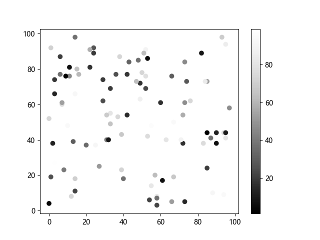 # 这三行代码使编译器能够绘图: import sys import matplotlib matplotlib.use('Agg') import matplotlib.pyplot as plt import numpy as np x = np.random.randint(100, size=(100)) y = np.random.randint(100, size=(100)) colors = np.random.randint(100, size=(100)) # 使用反向灰度渐变绘制散点图: plt.scatter(x, y, c=colors, cmap='Greys_r') plt.colorbar() plt.show() # 这两行代码使编译器能够输出图形: plt.savefig(sys.stdout.buffer) sys.stdout.flush()