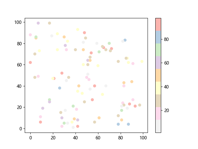 # 这三行代码使编译器能够绘图: import sys import matplotlib matplotlib.use('Agg') import matplotlib.pyplot as plt import numpy as np x = np.random.randint(100, size=(100)) y = np.random.randint(100, size=(100)) colors = np.random.randint(100, size=(100)) # 绘制反向 Pastel1 配色方案的散点图: plt.scatter(x, y, c=colors, cmap='Pastel1_r') plt.colorbar() plt.show() # 这两行代码使编译器能够输出图形: plt.savefig(sys.stdout.buffer) sys.stdout.flush()