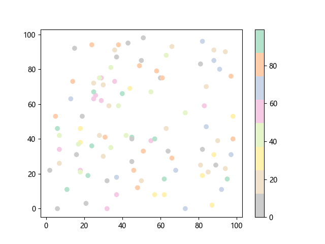 # 这三行代码使编译器能够绘图: import sys import matplotlib matplotlib.use('Agg') import matplotlib.pyplot as plt import numpy as np # 生成 100 个随机 x 坐标: x = np.random.randint(100, size=(100)) # 生成 100 个随机 y 坐标: y = np.random.randint(100, size=(100)) # 生成 100 个随机颜色值: colors = np.random.randint(100, size=(100)) # 绘制彩色散点图 plt.scatter(x, y, c=colors, cmap='Pastel2_r') plt.colorbar() # 显示颜色条 plt.show() # 显示图形 # 这两行代码使编译器能够输出图形: plt.savefig(sys.stdout.buffer) sys.stdout.flush()