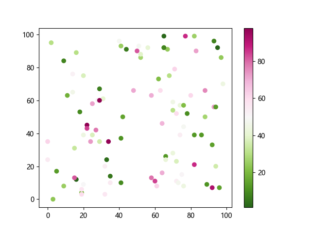 # 这三行代码使编译器能够绘图: import sys import matplotlib matplotlib.use('Agg') import matplotlib.pyplot as plt import numpy as np # 生成随机数据: x = np.random.randint(100, size=(100)) y = np.random.randint(100, size=(100)) colors = np.random.randint(100, size=(100)) # 使用 PiYG_r 配色方案绘制粉绿反向渐变色散点图: plt.scatter(x, y, c=colors, cmap='PiYG_r') plt.colorbar() # 显示颜色条 plt.show() # 显示图形 # 这两行代码使编译器能够输出图形: plt.savefig(sys.stdout.buffer) sys.stdout.flush()