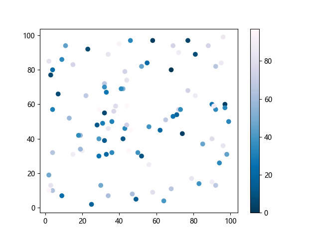 # 这三行代码使编译器能够绘图: import sys import matplotlib matplotlib.use('Agg') import matplotlib.pyplot as plt import numpy as np # 生成随机数据: x = np.random.randint(100, size=(100)) y = np.random.randint(100, size=(100)) colors = np.random.randint(100, size=(100)) # 使用 PuBu_r 配色方案绘制紫蓝色反向渐变色散点图: plt.scatter(x, y, c=colors, cmap='PuBu_r') plt.colorbar() # 显示颜色条 plt.show() # 显示图形 # 这两行代码使编译器能够输出图形: plt.savefig(sys.stdout.buffer) sys.stdout.flush()