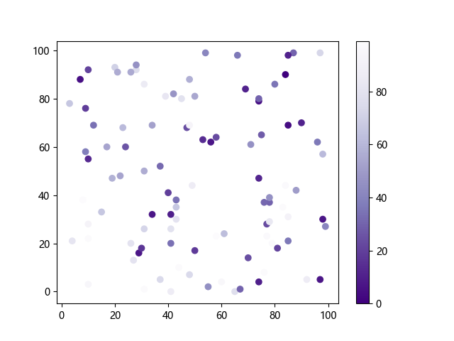 # 这三行代码使编译器能够绘图: import sys import matplotlib matplotlib.use('Agg') import matplotlib.pyplot as plt import numpy as np # 生成随机数据: x = np.random.randint(100, size=(100)) y = np.random.randint(100, size=(100)) colors = np.random.randint(100, size=(100)) # 使用 Purples_r 配色方案绘制紫色反向渐变色散点图: plt.scatter(x, y, c=colors, cmap='Purples_r') plt.colorbar() # 显示颜色条 plt.show() # 显示图形 # 这两行代码使编译器能够输出图形: plt.savefig(sys.stdout.buffer) sys.stdout.flush()
