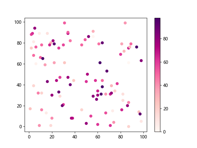 # 这三行代码使编译器能够绘图: import sys import matplotlib matplotlib.use('Agg') import matplotlib.pyplot as plt import numpy as np # 生成随机数据 x = np.random.randint(100, size=(100)) y = np.random.randint(100, size=(100)) colors = np.random.randint(100, size=(100)) # 使用 RdPu 配色方案绘制红紫色渐变色散点图: plt.scatter(x, y, c=colors, cmap='RdPu') plt.colorbar() # 显示颜色条 plt.show() # 显示图形 # 这两行代码使编译器能够输出图形: plt.savefig(sys.stdout.buffer) sys.stdout.flush()