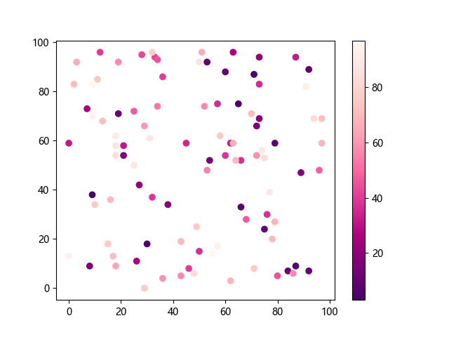 # 这三行代码使编译器能够绘图: import sys import matplotlib matplotlib.use('Agg') import matplotlib.pyplot as plt import numpy as np # 生成随机数据: x = np.random.randint(100, size=(100)) y = np.random.randint(100, size=(100)) colors = np.random.randint(100, size=(100)) # 使用 RdPu_r 配色方案绘制红紫色反向渐变色散点图: plt.scatter(x, y, c=colors, cmap='RdPu_r') plt.colorbar() # 显示颜色条 plt.show() # 显示图形 # 这两行代码使编译器能够输出图形: plt.savefig(sys.stdout.buffer) sys.stdout.flush()