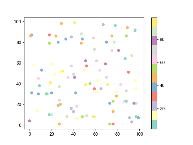 # 这三行代码使编译器能够绘图: import sys import matplotlib matplotlib.use('Agg') import matplotlib.pyplot as plt import numpy as np # 生成随机数据: x = np.random.randint(100, size=(100)) y = np.random.randint(100, size=(100)) colors = np.random.randint(100, size=(100)) # 使用 Set3 (12 色调色板)配色方案绘制 Set3 离散色散点图: plt.scatter(x, y, c=colors, cmap='Set3') plt.colorbar() # 显示颜色条 plt.show() # 显示图形 # 这两行代码使编译器能够输出图形: plt.savefig(sys.stdout.buffer) sys.stdout.flush()