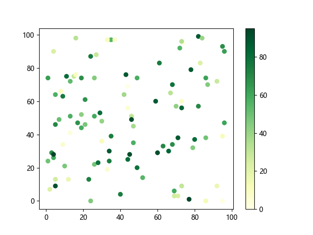 # 这三行代码使编译器能够绘图: import sys import matplotlib matplotlib.use('Agg') import matplotlib.pyplot as plt import numpy as np # 生成随机数据: x = np.random.randint(100, size=(100)) y = np.random.randint(100, size=(100)) colors = np.random.randint(100, size=(100)) # 使用 YlGn (黄-绿渐变)配色方案绘制散点图: plt.scatter(x, y, c=colors, cmap='YlGn') plt.colorbar() # 显示颜色条 plt.show() # 显示图形 # 这两行代码使编译器能够输出图形: plt.savefig(sys.stdout.buffer) sys.stdout.flush()