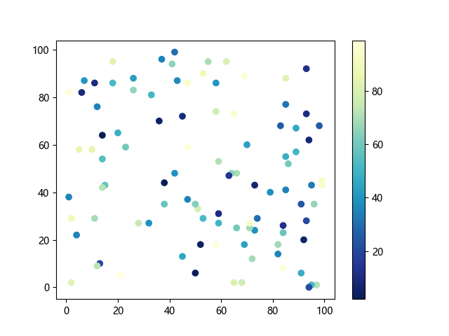 # 这三行代码使编译器能够绘图: import sys import matplotlib matplotlib.use('Agg') import matplotlib.pyplot as plt import numpy as np # 生成随机数据点: x = np.random.randint(100, size=(100)) y = np.random.randint(100, size=(100)) colors = np.random.randint(100, size=(100)) # 使用 YlGnBu_r (黄-绿-蓝反向渐变)配色方案绘制散点图: plt.scatter(x, y, c=colors, cmap='YlGnBu_r') plt.colorbar() # 显示颜色条 plt.show() # 显示图形 # 这两行代码使编译器能够输出图形: plt.savefig(sys.stdout.buffer) sys.stdout.flush()