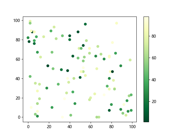 # 这三行代码使编译器能够绘图: import sys import matplotlib matplotlib.use('Agg') import matplotlib.pyplot as plt import numpy as np # 生成随机数据: x = np.random.randint(100, size=(100)) y = np.random.randint(100, size=(100)) colors = np.random.randint(100, size=(100)) # 使用YlGn_r(黄-绿反向渐变)配色方案绘制散点图: plt.scatter(x, y, c=colors, cmap='YlGn_r') plt.colorbar() # 显示颜色条 plt.show() # 显示图形 # 这两行代码使编译器能够输出图形: plt.savefig(sys.stdout.buffer) sys.stdout.flush()
