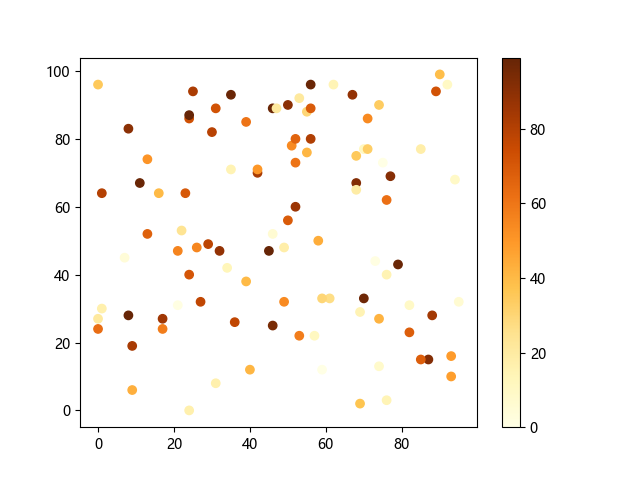 # 这三行代码使编译器能够绘图: import sys import matplotlib matplotlib.use('Agg') import matplotlib.pyplot as plt import numpy as np # 生成随机数据: x = np.random.randint(100, size=(100)) y = np.random.randint(100, size=(100)) colors = np.random.randint(100, size=(100)) # 使用 YlOrBr (黄-橙-棕渐变)配色方案绘制黄橙棕渐变散点图: plt.scatter(x, y, c=colors, cmap='YlOrBr') plt.colorbar() # 显示颜色条 plt.show() # 显示图形 # 这两行代码使编译器能够输出图形: plt.savefig(sys.stdout.buffer) sys.stdout.flush()