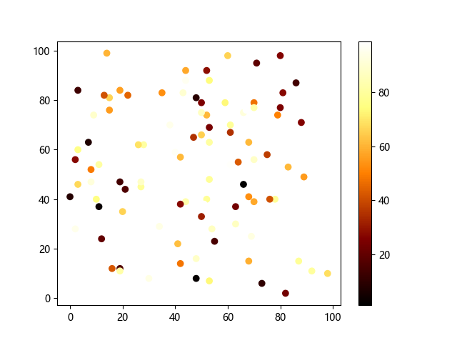# 这三行代码使编译器能够绘图: import sys import matplotlib matplotlib.use('Agg') import matplotlib.pyplot as plt import numpy as np # 生成随机数据: x = np.random.randint(100, size=(100)) y = np.random.randint(100, size=(100)) colors = np.random.randint(100, size=(100)) # 使用 afmhot (热金属)配色方案绘制热金属色散点图: plt.scatter(x, y, c=colors, cmap='afmhot') plt.colorbar() # 显示颜色条 plt.show() # 显示图形 # 这两行代码使编译器能够输出图形: plt.savefig(sys.stdout.buffer) sys.stdout.flush()