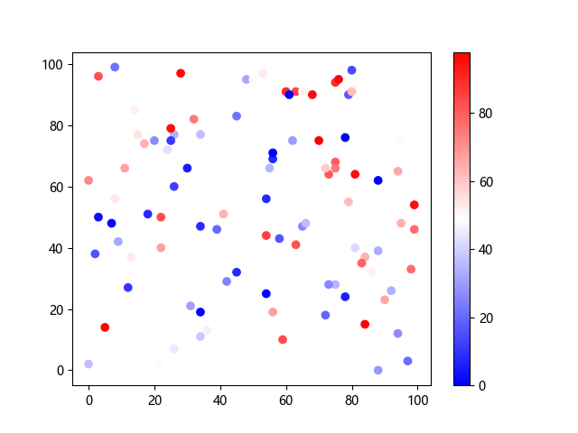 # 这三行代码使编译器能够绘图: import sys import matplotlib matplotlib.use('Agg') import matplotlib.pyplot as plt import numpy as np # 生成随机数据 x = np.random.randint(100, size=(100)) y = np.random.randint(100, size=(100)) colors = np.random.randint(100, size=(100)) # 使用 bwr 配色方案绘制蓝白红渐变色散点图: plt.scatter(x, y, c=colors, cmap='bwr') plt.colorbar() plt.show() # 这两行代码使编译器能够输出图形: plt.savefig(sys.stdout.buffer) sys.stdout.flush()