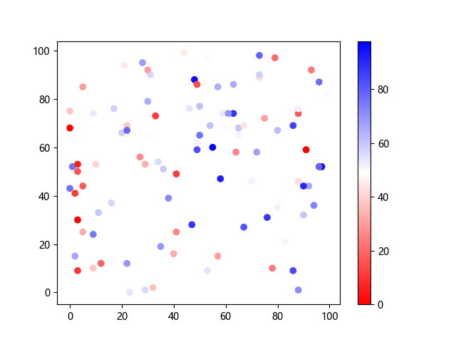 # 这三行代码使编译器能够绘图: import sys import matplotlib matplotlib.use('Agg') import matplotlib.pyplot as plt import numpy as np # 生成随机数据点 x = np.random.randint(100, size=(100)) y = np.random.randint(100, size=(100)) colors = np.random.randint(100, size=(100)) # 使用 bwr_r 配色方案绘制蓝白红反向渐变色散点图: plt.scatter(x, y, c=colors, cmap='bwr_r') plt.colorbar() plt.show() # 这两行代码使编译器能够输出图形: plt.savefig(sys.stdout.buffer) sys.stdout.flush()