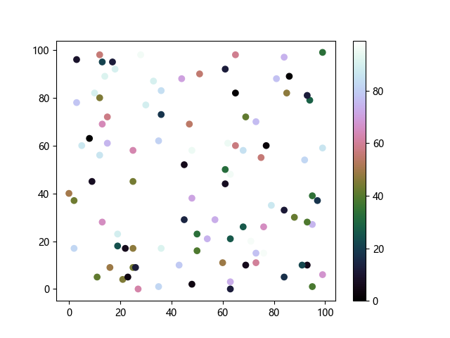 # 这三行代码使编译器能够绘图: import sys import matplotlib matplotlib.use('Agg') import matplotlib.pyplot as plt import numpy as np # 生成随机数据 x = np.random.randint(100, size=(100)) y = np.random.randint(100, size=(100)) colors = np.random.randint(100, size=(100)) # 使用 cubehelix 配色方案绘制螺旋立方体渐变色散点图: plt.scatter(x, y, c=colors, cmap='cubehelix') plt.colorbar() plt.show() # 这两行代码使编译器能够输出图形: plt.savefig(sys.stdout.buffer) sys.stdout.flush()