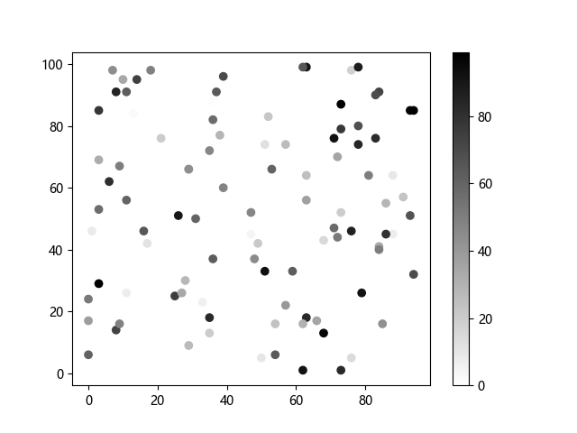 # 这三行代码使编译器能够绘图: import sys import matplotlib matplotlib.use('Agg') import matplotlib.pyplot as plt import numpy as np # 生成随机数据点 x = np.random.randint(100, size=(100)) y = np.random.randint(100, size=(100)) colors = np.random.randint(100, size=(100)) # 使用 gist_gray_r 配色方案绘制灰度反向渐变色散点图: plt.scatter(x, y, c=colors, cmap='gist_gray_r') plt.colorbar() plt.show() # 这两行代码使编译器能够输出图形: plt.savefig(sys.stdout.buffer) sys.stdout.flush()