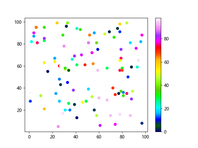 # 这三行代码使编译器能够绘图: import sys import matplotlib matplotlib.use('Agg') import matplotlib.pyplot as plt import numpy as np # 生成随机数据 x = np.random.randint(100, size=(100)) y = np.random.randint(100, size=(100)) colors = np.random.randint(100, size=(100)) # 使用 gist_ncar 配色方案绘制NCAR渐变色散点图: plt.scatter(x, y, c=colors, cmap='gist_ncar') plt.colorbar() plt.show() # 这两行代码使编译器能够输出图形: plt.savefig(sys.stdout.buffer) sys.stdout.flush()
