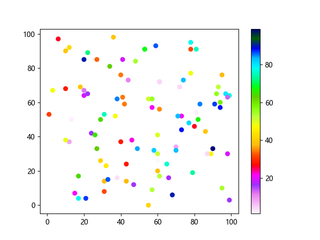 # 这三行代码使编译器能够绘图: import sys import matplotlib matplotlib.use('Agg') import matplotlib.pyplot as plt import numpy as np # 生成随机数据点 x = np.random.randint(100, size=(100)) y = np.random.randint(100, size=(100)) colors = np.random.randint(100, size=(100)) # 使用 gist_ncar_r 配色方案绘制 NCAR 反向渐变色散点图: plt.scatter(x, y, c=colors, cmap='gist_ncar_r') plt.colorbar() plt.show() # 这两行代码使编译器能够输出图形: plt.savefig(sys.stdout.buffer) sys.stdout.flush()