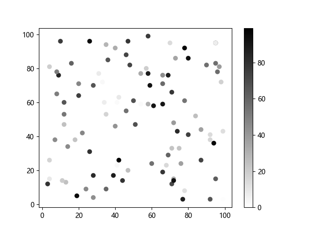 # 这三行代码使编译器能够绘图: import sys import matplotlib matplotlib.use('Agg') import matplotlib.pyplot as plt import numpy as np # 生成随机数据 x = np.random.randint(100, size=(100)) y = np.random.randint(100, size=(100)) colors = np.random.randint(100, size=(100)) # 使用 gist_yarg 配色方案绘制灰度渐变色散点图: plt.scatter(x, y, c=colors, cmap='gist_yarg') plt.colorbar() plt.show() # 这两行代码使编译器能够输出图形: plt.savefig(sys.stdout.buffer) sys.stdout.flush()
