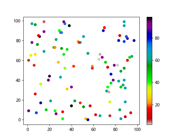 #Three lines to make our compiler able to draw: import sys import matplotlib matplotlib.use('Agg') import matplotlib.pyplot as plt import numpy as np x = np.random.randint(100, size=(100)) y = np.random.randint(100, size=(100)) colors = np.random.randint(100, size=(100)) plt.scatter(x, y, c=colors, cmap='nipy_spectral_r') plt.colorbar() plt.show() #Two lines to make our compiler able to draw: plt.savefig(sys.stdout.buffer) sys.stdout.flush()