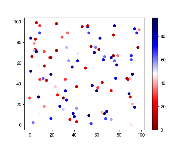 # 以下三行代码使编译器支持绘图功能: import sys import matplotlib matplotlib.use('Agg') import matplotlib.pyplot as plt import numpy as np # 生成随机数据: x = np.random.randint(100, size=(100)) y = np.random.randint(100, size=(100)) colors = np.random.randint(100, size=(100)) # 使用 seismic 反向配色方案创建散点图: plt.scatter(x, y, c=colors, cmap='seismic_r') plt.colorbar() plt.show() # 以下两行代码使编译器能够输出图形: plt.savefig(sys.stdout.buffer) sys.stdout.flush()