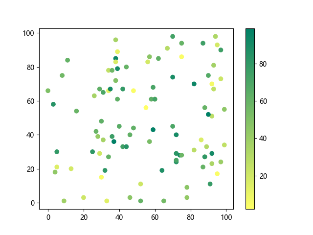 # 以下三行代码使编译器支持绘图功能: import sys import matplotlib matplotlib.use('Agg') import matplotlib.pyplot as plt import numpy as np # 生成随机数据: x = np.random.randint(100, size=(100)) y = np.random.randint(100, size=(100)) colors = np.random.randint(100, size=(100)) # 使用 summer 反向配色方案创建散点图: plt.scatter(x, y, c=colors, cmap='summer_r') plt.colorbar() plt.show() # 以下两行代码使编译器能够输出图形: plt.savefig(sys.stdout.buffer) sys.stdout.flush()