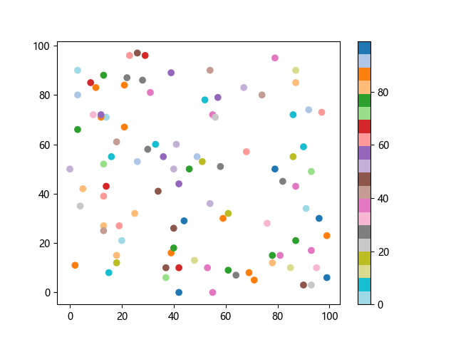 # 以下三行代码使编译器支持绘图功能: import sys import matplotlib matplotlib.use('Agg') import matplotlib.pyplot as plt import numpy as np # 生成随机数据: x = np.random.randint(100, size=(100)) y = np.random.randint(100, size=(100)) colors = np.random.randint(100, size=(100)) # 使用 tab20 反向离散配色方案创建散点图: plt.scatter(x, y, c=colors, cmap='tab20_r') plt.colorbar() plt.show() # 以下两行代码使编译器能够输出图形: plt.savefig(sys.stdout.buffer) sys.stdout.flush()