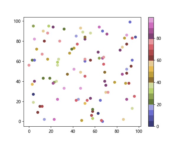 # 以下三行代码使编译器支持绘图功能: import sys import matplotlib matplotlib.use('Agg') import matplotlib.pyplot as plt import numpy as np # 生成随机数据: x = np.random.randint(100, size=(100)) y = np.random.randint(100, size=(100)) colors = np.random.randint(100, size=(100)) # 使用 tab20b 离散配色方案创建散点图: plt.scatter(x, y, c=colors, cmap='tab20b') plt.colorbar() plt.show() # 以下两行代码使编译器能够输出图形: plt.savefig(sys.stdout.buffer) sys.stdout.flush()