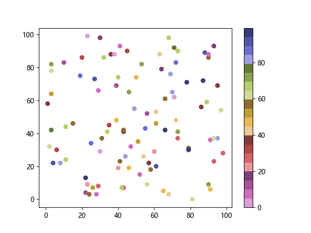 # 以下三行代码使编译器支持绘图功能: import sys import matplotlib matplotlib.use('Agg') import matplotlib.pyplot as plt import numpy as np # 生成随机数据: x = np.random.randint(100, size=(100)) y = np.random.randint(100, size=(100)) colors = np.random.randint(100, size=(100)) # 使用 tab20b 反向离散配色方案创建散点图: plt.scatter(x, y, c=colors, cmap='tab20b_r') plt.colorbar() plt.show() # 以下两行代码使编译器能够输出图形: plt.savefig(sys.stdout.buffer) sys.stdout.flush()