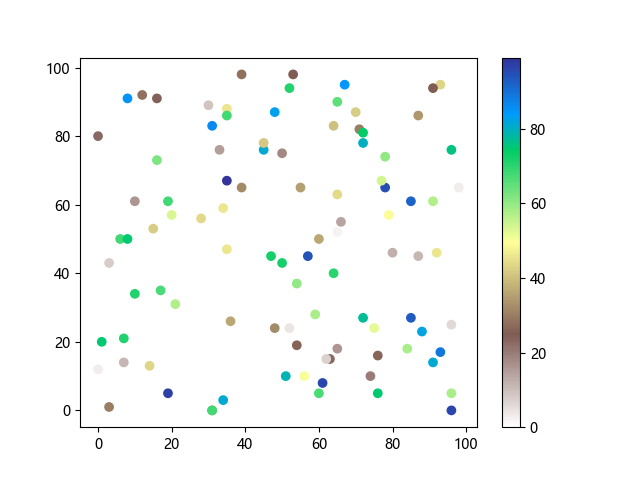 # 以下三行代码使编译器支持绘图功能: import sys import matplotlib matplotlib.use('Agg') import matplotlib.pyplot as plt import numpy as np # 生成随机数据: x = np.random.randint(100, size=(100)) y = np.random.randint(100, size=(100)) colors = np.random.randint(100, size=(100)) # 使用地形反向 (terrain_r) 配色方案创建散点图: plt.scatter(x, y, c=colors, cmap='terrain_r') plt.colorbar() plt.show() # 以下两行代码使编译器能够输出图形: plt.savefig(sys.stdout.buffer) sys.stdout.flush()