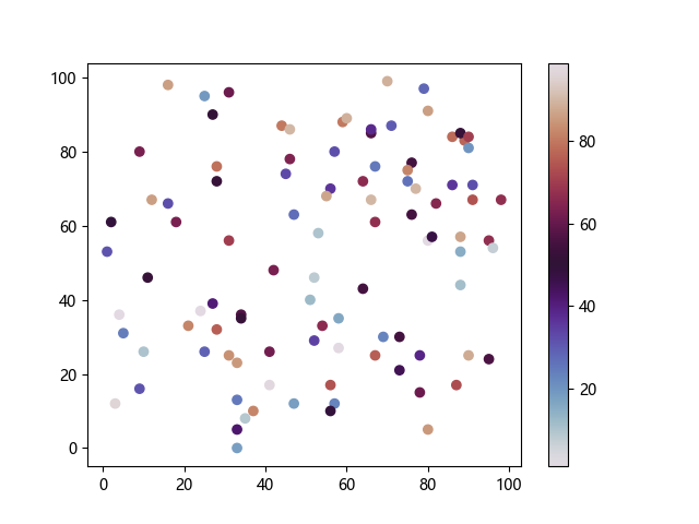 # 以下三行代码使编译器支持绘图功能: import sys import matplotlib matplotlib.use('Agg') import matplotlib.pyplot as plt import numpy as np # 生成随机数据: x = np.random.randint(100, size=(100)) y = np.random.randint(100, size=(100)) colors = np.random.randint(100, size=(100)) # 使用 twilight 配色方案创建散点图: plt.scatter(x, y, c=colors, cmap='twilight') plt.colorbar() plt.show() # 以下两行代码使编译器能够输出图形: plt.savefig(sys.stdout.buffer) sys.stdout.flush()