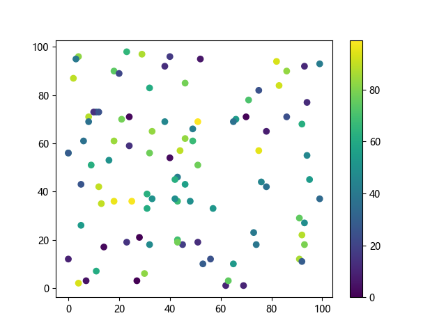 # 以下三行代码使编译器支持绘图功能: import sys import matplotlib matplotlib.use('Agg') import matplotlib.pyplot as plt import numpy as np # 生成随机数据: x = np.random.randint(100, size=(100)) y = np.random.randint(100, size=(100)) colors = np.random.randint(100, size=(100)) # 使用 viridis 配色方案创建散点图: plt.scatter(x, y, c=colors, cmap='viridis') plt.colorbar() plt.show() # 以下两行代码使编译器能够输出图形: plt.savefig(sys.stdout.buffer) sys.stdout.flush()