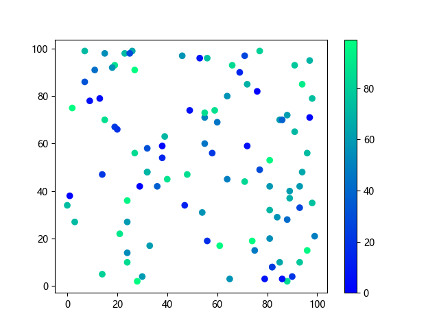 # 以下三行代码使编译器支持绘图功能: import sys import matplotlib matplotlib.use('Agg') import matplotlib.pyplot as plt import numpy as np # 生成随机数据: x = np.random.randint(100, size=(100)) y = np.random.randint(100, size=(100)) colors = np.random.randint(100, size=(100)) # 使用冬季 (winter) 配色方案创建散点图: plt.scatter(x, y, c=colors, cmap='winter') plt.colorbar() plt.show() # 以下两行代码使编译器能够输出图形: plt.savefig(sys.stdout.buffer) sys.stdout.flush()