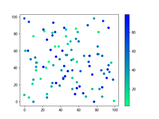 # 以下三行代码使编译器支持绘图功能: import sys import matplotlib matplotlib.use('Agg') import matplotlib.pyplot as plt import numpy as np # 生成随机数据: x = np.random.randint(100, size=(100)) y = np.random.randint(100, size=(100)) colors = np.random.randint(100, size=(100)) # 使用冬季反向 (winter_r) 配色方案创建散点图: plt.scatter(x, y, c=colors, cmap='winter_r') plt.colorbar() plt.show() # 以下两行代码使编译器能够输出图形: plt.savefig(sys.stdout.buffer) # 将图形保存到标准输出缓冲区 sys.stdout.flush() # 刷新输出缓冲区