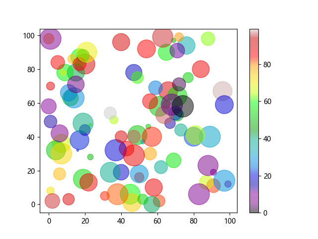 # 以下三行代码使编译器支持绘图功能: import sys import matplotlib matplotlib.use('Agg') import matplotlib.pyplot as plt import numpy as np # 生成随机数据: x = np.random.randint(100, size=(100)) y = np.random.randint(100, size=(100)) colors = np.random.randint(100, size=(100)) sizes = 10 * np.random.randint(100, size=(100)) # 点大小(10-990随机值) # 使用光谱配色、半透明效果创建散点图: plt.scatter(x, y, c=colors, s=sizes, alpha=0.5, cmap='nipy_spectral') plt.colorbar() plt.show() # 以下两行代码使编译器能够输出图形: plt.savefig(sys.stdout.buffer) sys.stdout.flush()