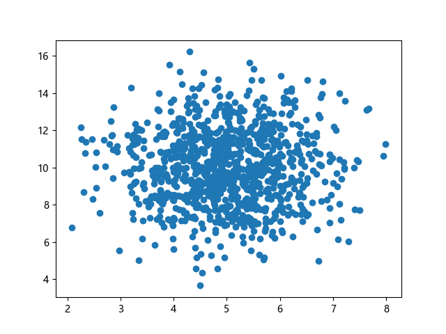 # 三行配置使编译器支持绘图功能: import sys import matplotlib matplotlib.use('Agg') import numpy import matplotlib.pyplot as plt # 生成正态分布数据:x~N(5.0,1.0),y~N(10.0,2.0),各 1000 个样本点: x = numpy.random.normal(5.0, 1.0, 1000) y = numpy.random.normal(10.0, 2.0, 1000) # 绘制散点图 plt.scatter(x, y) plt.show() # 两行代码实现图形输出: plt.savefig(sys.stdout.buffer) sys.stdout.flush()