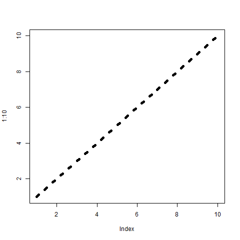 # 我们需要这行代码才能在编译器中显示图表 png(filename="output.png") # 绘制从 1 到 10 的数字并绘制一条粗虚线 plot(1:10, type="l", lwd=5, lty=3)