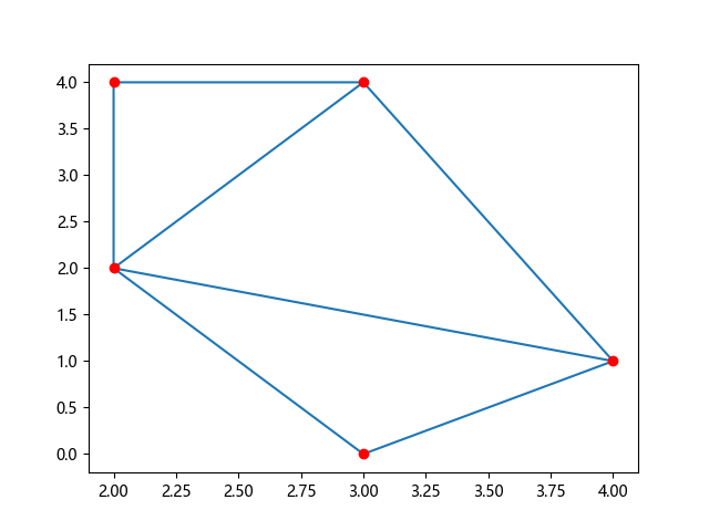 # 三行配置使编译器支持绘图功能: import sys import matplotlib matplotlib.use('Agg') import numpy as np from scipy.spatial import Delaunay import matplotlib.pyplot as plt # 定义二维点集: points = np.array([ [2, 4], # 点 1 坐标 [3, 4], # 点 2 坐标 [3, 0], # 点 3 坐标 [2, 2], # 点 4 坐标 [4, 1] # 点 5 坐标 ]) # 计算 Delaunay 三角剖分: simplices = Delaunay(points).simplices # 绘制三角网格和散点图: plt.triplot(points[:, 0], points[:, 1], simplices) # 绘制三角剖分 plt.scatter(points[:, 0], points[:, 1], color='r') # 绘制红色散点 plt.show() # 两行代码实现图形输出: plt.savefig(sys.stdout.buffer) sys.stdout.flush()